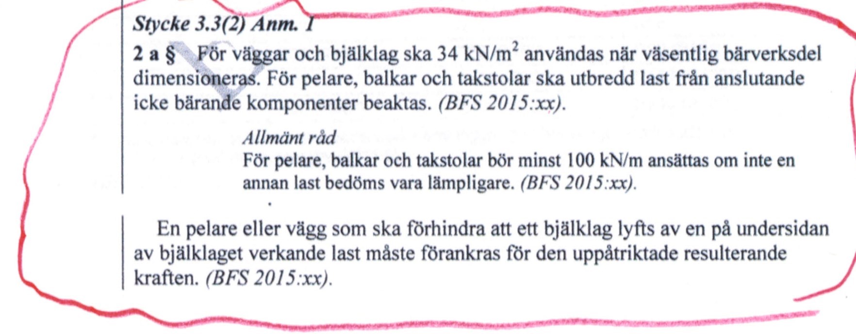Svar: Användning av A.8 i SS-EN 1991-1-7 gäller under förutsättning att det inte finns risk för påkörning på pelare, som om så är fallet ska dimensioneras (inklusive dess infästningar) för påkörningslast. Här är det fråga om andra ospecifika olyckslaster. Om detta inte hade behandlats i EKS skulle svaret ha varit enkelt och lasten 34 kN/m2 ha ansatts på pelarens sidoytor (en i taget) för dimensionering av infästningarna.