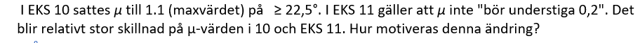 Fråga 1): Ska 12 a § i EKS 11 användas endast för fall (ii) och (iii) (snödrift)? Och att för fall (i) används fortfarande μ1(α1) och μ1(α2). Anmärkningen längst ned i kapitel 5.3.3 i SS-EN 1991-1-3 antyder detta men andra personer och även handböcker menar att det som står i EKS 11 alltid ska användas, även för fall (i).